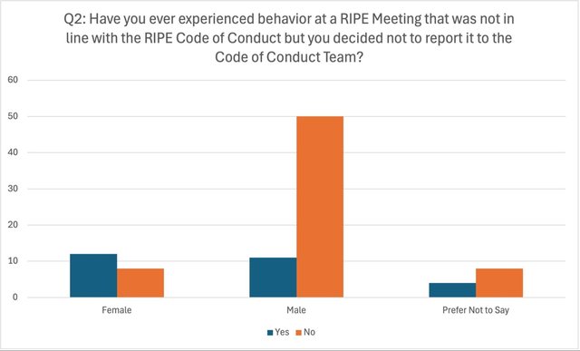 - Have you ever experienced behaviour at a RIPE Meeting that was not in line with the RIPE Code of Conduct but you decided not to report it to the Code of Conduct Team? (Yes, No)