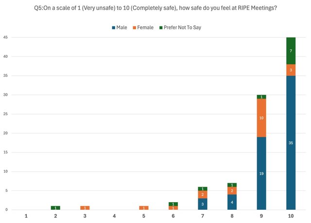 - Finally, on a scale of 1 (Very unsafe) to 10 (Completely safe), how safe do you feel at RIPE Meetings? (Scale 1-10)