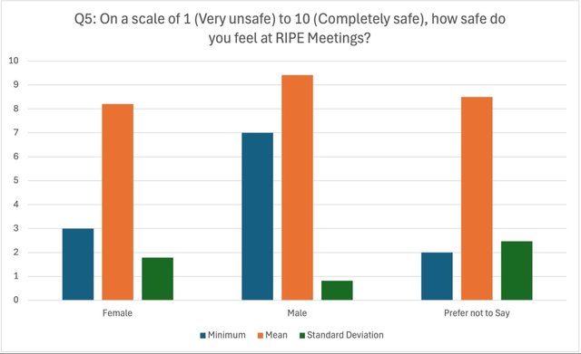 While the majority of respondents to Question #5 indicated they felt safe at RIPE meetings, the disparity in standard deviation between men and others is interesting. It displays a consistency in feeling safe that is exclusive to male respondents. The minimums are also telling. Three times more men than women responded to the survey - yet the lowest answer given to Question #5 by a man was 7, while the lowest answer given by a woman was 3, and the lowest answer given by respondents who preferred not to reveal their gender was 2.