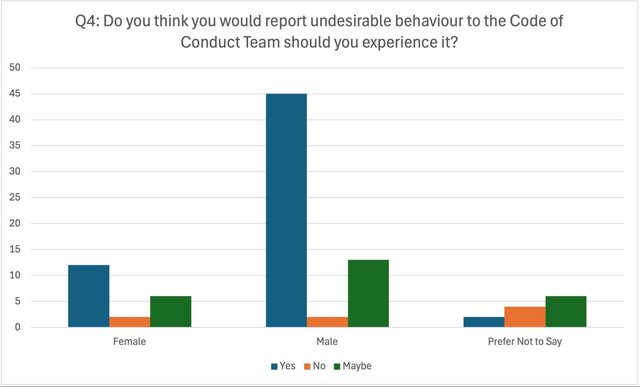 4. Do you think you would report undesirable behaviour to the Code of Conduct Team should you experience it? (Freeform response)