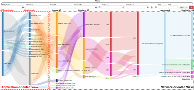- The Network-oriented view (right side): This section maintains the traditional infrastructure perspective, mapping those application flows through the sequence of Source, Handover, Nexthop, and Destination ASes