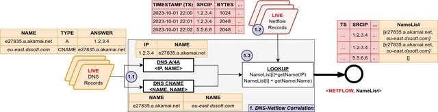 1. DNS-Netflow Correlation. The output of this component includes extended and correlated data: Netflow and a list of Hostnames/URLs representing a DNS domain name resolution. The sequence of events are: