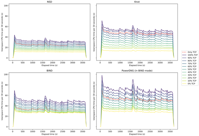 Figure 2 shows a graph for every name server implementation that we tested. The graphs show the CPU time used every 30 seconds over time, as measured during our experiments. They all have 12 lines, 11 of which show the CPU time used every 30 seconds when a specific percentage of queries is retried over TCP. The red dashed line shows the CPU time used when all queries are sent over TCP only. All lines represent the average of the 10 independent measurements we performed for that experiment. To verify that the average was representative, we plotted the individual measurements and checked how they varied. The variance we observed was low enough to justify using the mean, with at most one outlier per experiment.