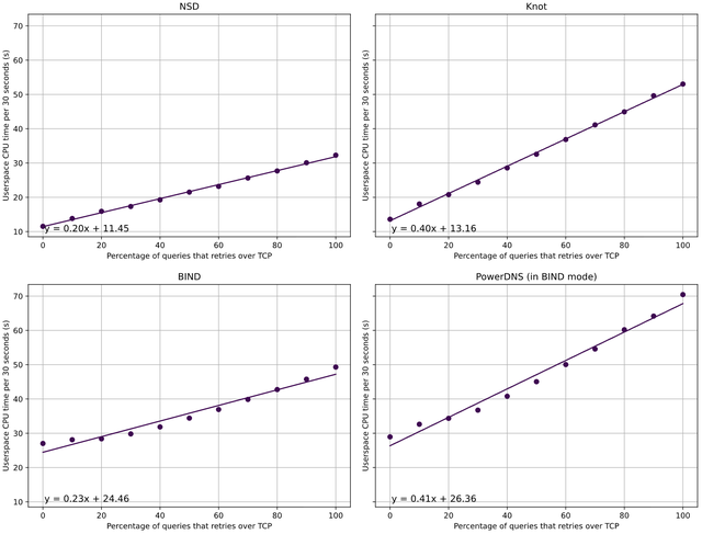 With all the name servers, each incremental increase in the percentage of retries over TCP leads to higher CPU time usage. For NSD and Knot, the increase between the lines also seems to be around the same value every time. That suggests that there might be a linear relationship between the percentage of TCP retries and the CPU time used.