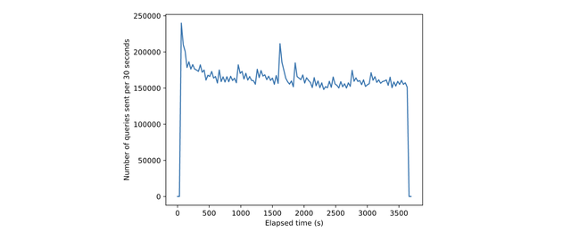 The figure shows the number of queries sent every 30 seconds for the whole hour of the experiment. The queries are grouped into 30-second intervals, aligning with our metric measurements, which are also taken every thirty seconds. That arrangement makes it easier to identify any correlation between the peaks in this graph and the later graphs of these metrics. For this experiment, we used a copy of the zone file from the same day so that it was able to respond to a query whenever the actual .nl name server would also have responded. For privacy reasons, the query data and corresponding zone file were pseudonymised versions of the originals, with every domain name replaced by a randomised string of the same length. All IP addresses were also anonymised.