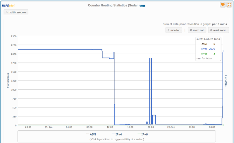 UPDATE (2013-09-26 10:28 UTC) : The last Sudanese AS that went missing from the routing table came back (around 10:00 UTC), and the number of IPv4 prefixes went up to normal levels again too (see Figure 4). Google's transparency report indicates traffic levels back to normal again around 10:00 UTC too.