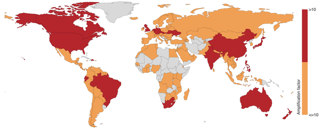 While 87% of the amplification factors are below ten, a few routers amplify single ICMP Echo requests exponentially, significantly increasing the threat potential of these devices. These routers are primarily located in Brazil (80%) and China (17%). The highest amplification factors can be observed in Germany and Japan.