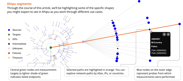 Why Khipu: Hubs stand out visually; filtering by hop/interface IP or ASN isolates all paths through a concentration point; Probes show which sources feed it. See it in Khipu.