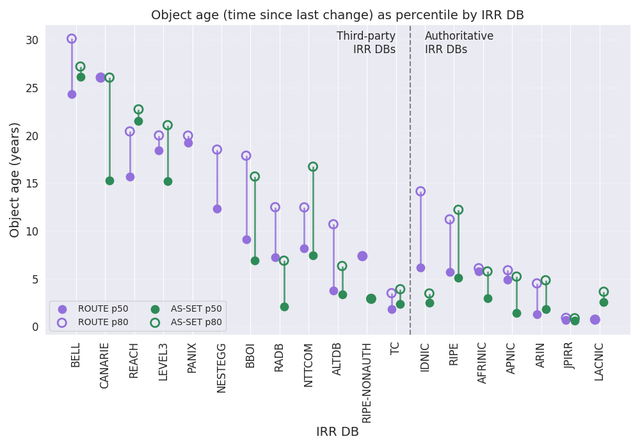 Authoritative IRR DBs, on the other hand, show a consistently younger age profile. Their p50 values cluster around 1–5 years, and even their p80 values often remain below 5–8 years, indicating fewer long-neglected objects (see “Normalized ROUTE object age distribution by category” plot above). The freshest datasets appear in LACNIC and JPNIC, where both medians and upper percentiles are very low, reflecting tightly integrated operational processes and regular updates tied to registry workflows.