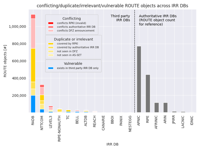 - Vulnerable (blue): Objects found only in third-party IRR DBs but covering active DFZ routes; these are easy to hijack by claiming ownership in a different IRR DB.