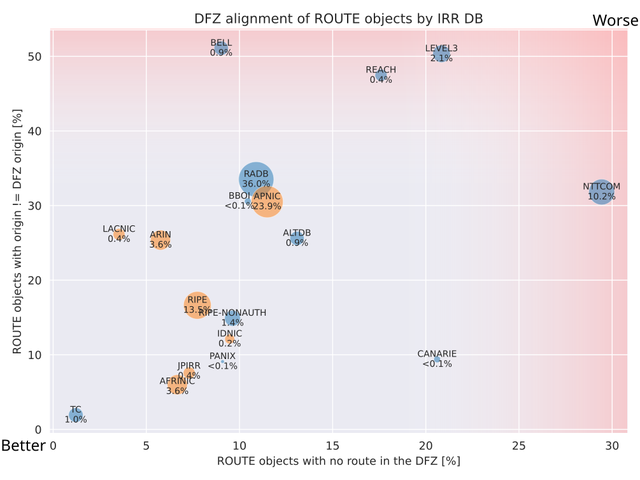 The bubble size indicates each DB's share of total ROUTE objects. Bubbles closer to the bottom left reflect better alignment with the DFZ and more relevant data for the current state of the global routing table. Authoritative IRR DBs are coloured orange, third-party IRR DBs blue. ROUTE objects conflicting with RPKI are excluded, as some IRR DBs no longer return them in queries.7