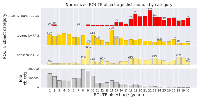 Specifically, the fraction of objects classified as "not seen in DFZ" increases from an average of ~4% for objects aged 1 - 5 years, to ~18% for those between 26 - 30 years. Similarly, RPKI coverage decreases substantially with age, dropping from ~50% to ~15%. At the same time, objects are more likely to be in conflict with their covering ROA, increasing from an average of ~0.2% to ~4%. To put the last number into context, the current share of invalid routes in the DFZ is ~2% as reported by NIST.5
