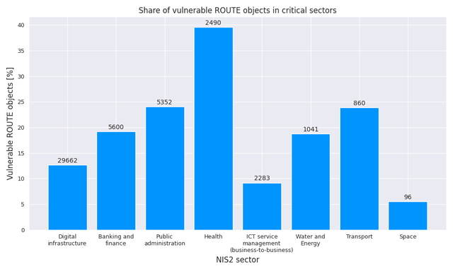 The distribution of vulnerable ROUTE objects varies significantly across NIS2 sectors. In absolute terms, Digital Infrastructure dominates with roughly 30k vulnerable ROUTE objects (out of ~235k total). However, looking at relative vulnerability, the Health sector shows by far the highest share (39.6%), followed by Public administration (24.1%) and Transport (23.9%). In contrast, sectors with a strong technical focus have notably lower vulnerability shares - Digital Infrastructure (12.7%), ICT Service Management (9.2%), and Space (5.5%). Overall, ROUTE object quality in critical sectors appears dependent on the technical expertise of its managing entities.